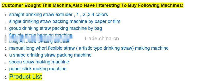 This drink straw making machine is mainly to produce drink straw,sprinkler pipe,otton stick,candy stick,tooth pick,tooth pick,the refills of ball point pen and water color pen,toy pipe industrial casing pipe,droping tube and other small open pipes etc.It uses the materials such as PE and PP etc.