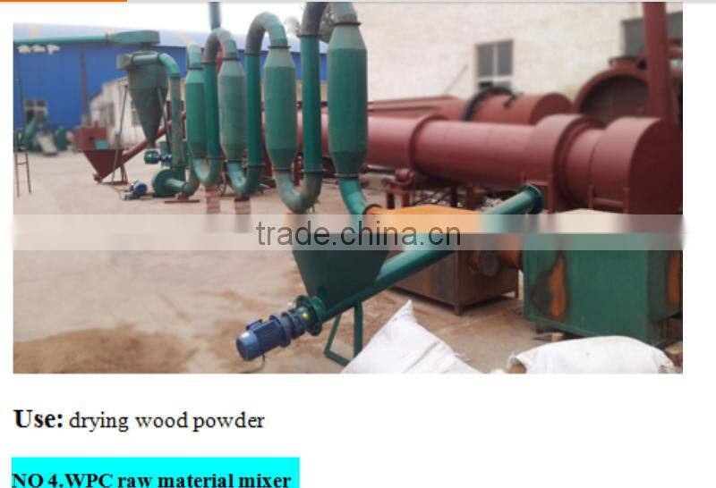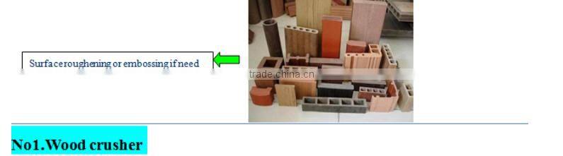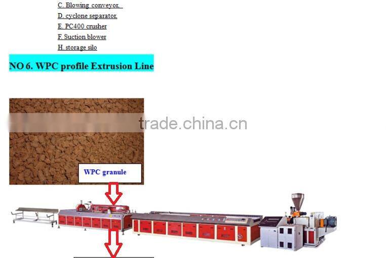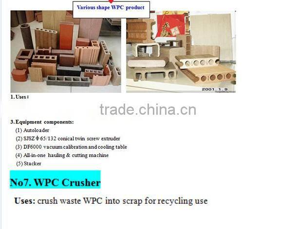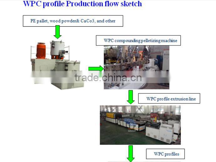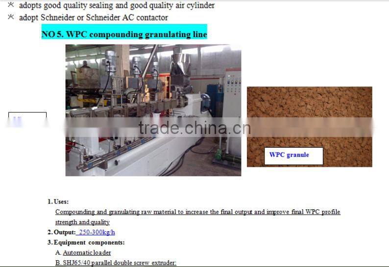 The production line with the following feather: 1)This technology is suitable to produce WPC products at high value with variety of plastic and nature fiber,and the material is 90% of waste plastic and waste natural fiber. 2)With scientific and reasonable technology,the machine has high efficiency and runs stably 3)The parallel twin screw extruder is used to mix the wood and plastic,and get good homogeneous melt. 4)This is one step WPC extrusion technology,which saves energy. 5)This production line can produce wpc products of different specifications only to change mold. 6)Imported PLC automatic control. |