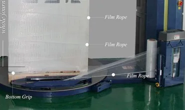 Pallet grip system : film bottom narrowed to become film rope , film rope grip to pallet & products during wrapping.