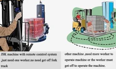 DriveX pallet stretch wrapper, worker just need put the pallet on the turntable and press remote control button,machine will wrap pallet automatically,during this time ,the worker no need get off the forklift truck and operate machine by hand .