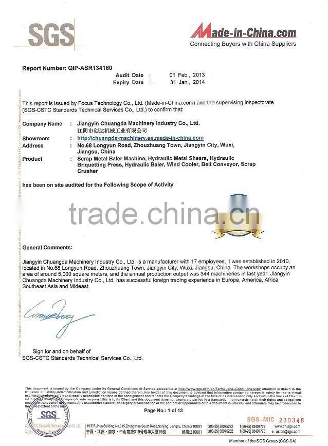 This machine is used for cold press metal scraps within 2~3mm in thickness under most circumstance. The processable material includes scrap steel, waste containers and disintegrated vehicle shell etc. After cold pressing into block, it is convenient for storage and transportation or putting into furnace.