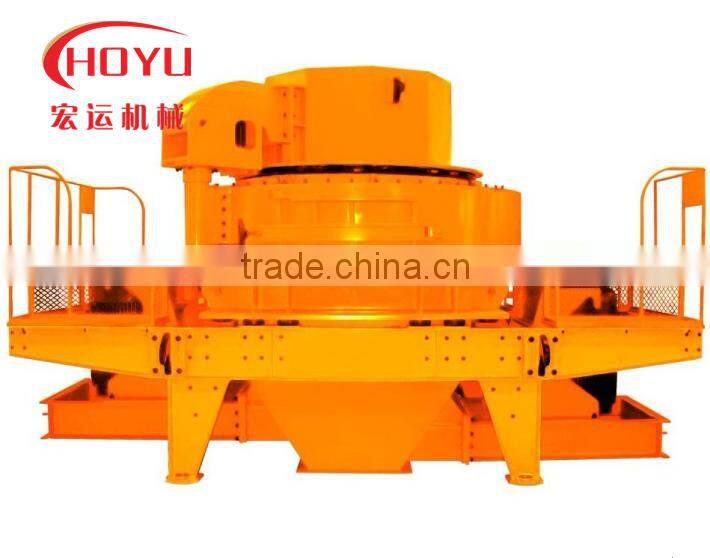 Sand making machine is the advanced crushing equipment developed by Hongyun Factory based on the present situation about sand making equipments’ application in our country. It is mainly composed of pedestal, holder, vortex crushing cavity, impeller, distributor, main shaft and other parts.Compound sand making machine is the indispensable fine device in the present sand production industry. Using the centrifugal force and impact force which are brought by itselves’ high speed running, it can achieve crushing effect to satisfy the sand making industry’s demand of materials’ granularity and size. Besides be used in sand making industry, it can also be used to crush harder ore material. It is an ideal crushing equipment which often be used in mineral processing, ore milling, metallurgy, chemical engineering, power industry, water resource industry and other different industries.