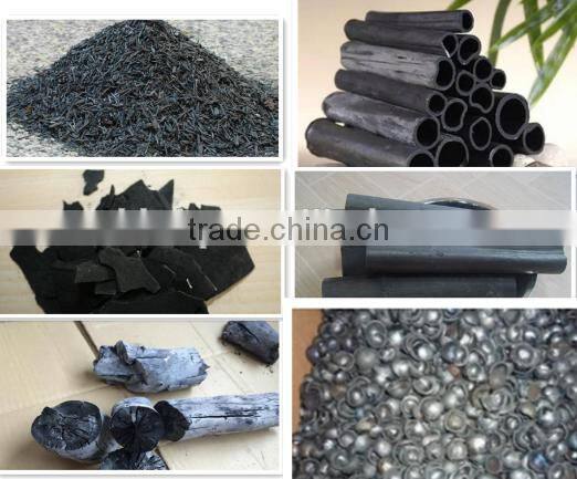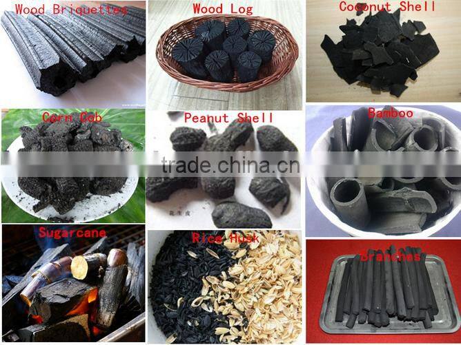 All kinds of wood, wood chips, wood branches, wood sawdust, wood wastes and other kinds of biomass like rice husks, peanut shells, coconut shells, wheat brans, bamboo, sugar cane, stalks, etc. And, the biomass briquettes like rice husk briquettes, wood briquettes can also be carbonized by our machine!