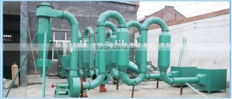 The wet sawdust is input into the hopper with screw feeding to avoid stocking. The stove generates hot air, hot air mixed with wet sawdust, and then sucked into the pipes by the exhaust blower(fan) , flowing and go though the curving pipes and buffer(drying chamber) of dryer, thus the wet sawdust is dried, and dried sawdust is discharged from the outlet with air lock.
