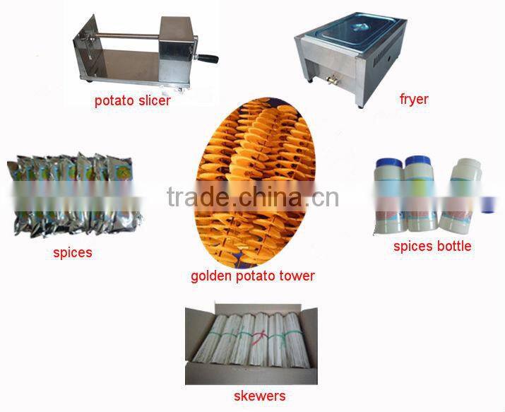 First, let us know what is the “potato tower”, it is the new public leisure snack food, it is to rotary-cut the potato into screw shape stringed by skewer which looks like tower, and then fried, seasoned with spices. The equipment to make the potato tower we called potato tower slicer, tornado potato slicer, spring potato chips slicer and so on .