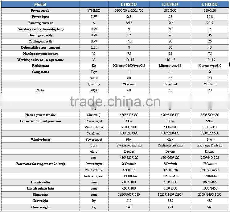 Note:The heating drying max temp--75C;the cooling drying min temp--8C;heating +dehumidify drying.