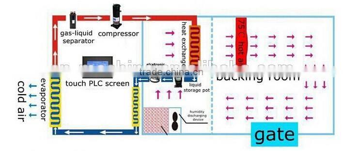 Heat pump is essentially a lifting device. Heat pump drying unit by the inverse Carnot principle, absorbs heat from the surrounding environment, and pass it to the object to be heated, it works the same as with the chiller, it is in accordance with the reverse Carnot cycle work. The only difference is the operating temperature range is not the same.
