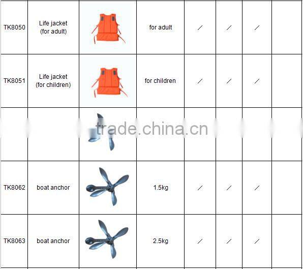 | Accessories | 1. Aluminum oars×1Pair 2. Netted sandwich cushion× 2 pcs 3. Middle size Foot pump × 1pc 4. Wooden strip board × 4pcs 5. Hand bag × 1pc 6. Professional repair kit × 1Set, 7. Fishing rod holders× 2pcs |