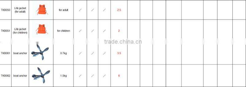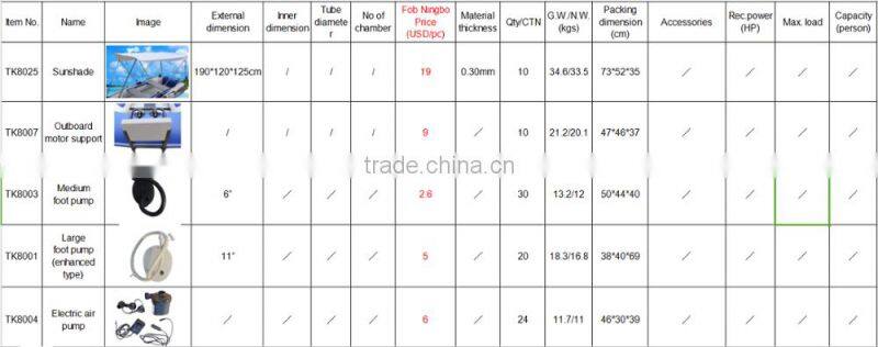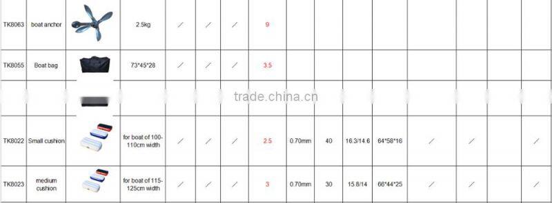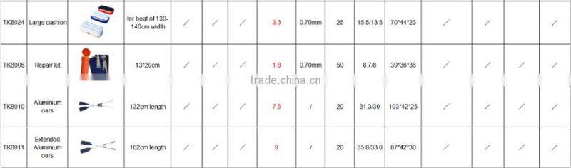 | Accessories | 1. Enhanced plastic oars×1Pair 2. PVC cushion× 2pcs 3. Middle size Foot pump × 1pc 4. Wooden strip board × 3pcs 5. Hand bag × 1pc 6. Professional repair kit × 1Set, 7. Fishing rod holders× 1pcs |