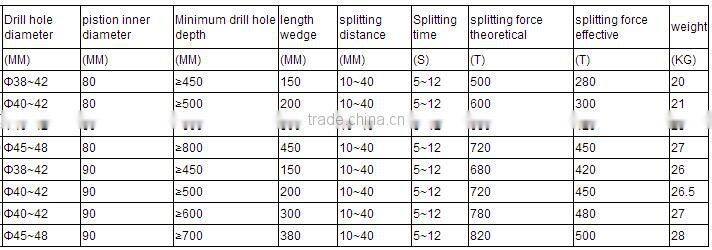 The hydraulic rock splitter is a kind of hand-hold splitting and demolition tool.It can controllably split rock or concrete.Especially suit for cabined area where large machine can not work.Such as hydraulic breaker and place where is strictly limited of noise,dust,flying debris,shake,exhaust gas,also widely use in the place where need non-explosive and blast forbidden.