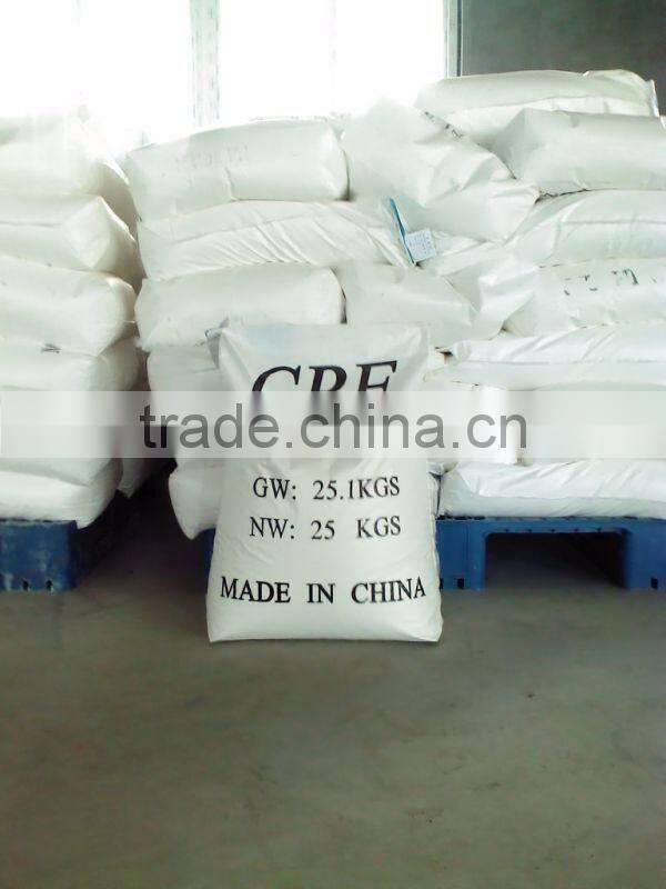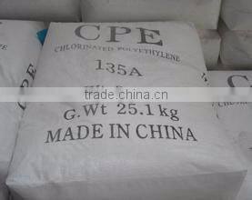 Chlorinated Polyethylene(CPE)135A, which is a white powder, is a kind of macromolecular material made from Low pressure polyethylene by chlorination reaction. The CPE materials are suit for kinds of plastic profile, construction, pipe fittings, electric wires, hollow rejection containers, accessory parts of auto and communication equipments and shells of home appliances as well as plasticizer for flexible plastic. Also, it is good to make such as sole of shoes, flexible pipes and waterproof rolls etc.