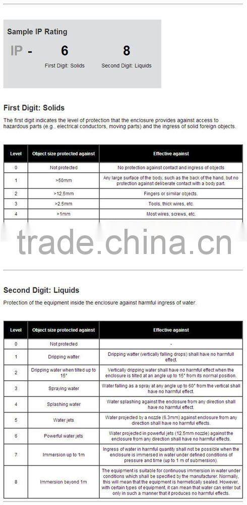 The IP Code (or International Protection Rating, sometimes also interpreted as Ingress Protection Rating*) consists of the letters IP followed by two digits and an optional letter. As defined in international standard IEC 60529, it classifies the degrees of protection provided against the intrusion of solid objects (including body parts like hands and fingers), dust, accidental contact, and water in electrical enclosures. The standard aims to provide users more detailed information than vague marketing terms such as waterproof.