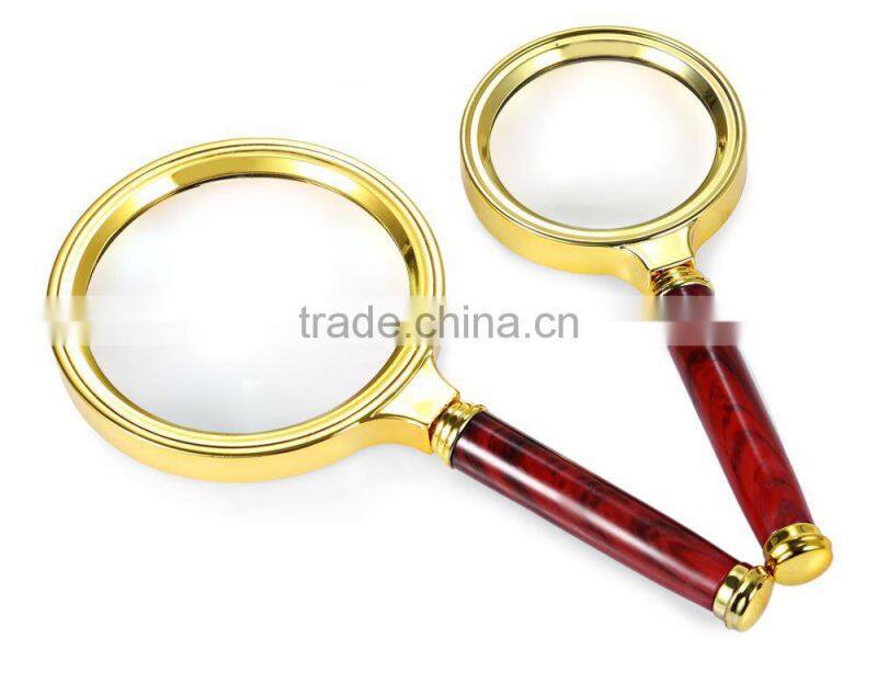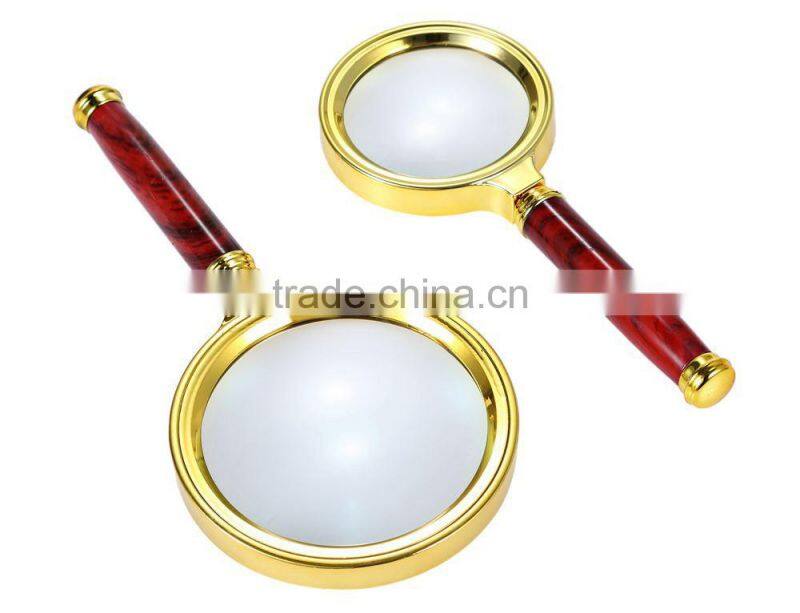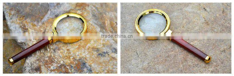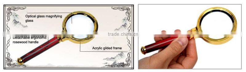 -80mm detachable ergonomic rosewood handle, optical lens, gold tone metal frame.