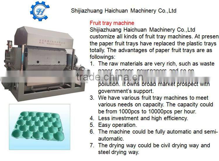 The fruit trays machine which produce the fruit trays is one of the pulp molding machines whose production process is same as the egg tray machine. Its main raw material is also waste paper. This kind of pulp molding machine is the machine which our country support strongly.