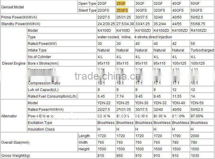 | Voltage | Prime Power | Standby Power | Rated Frequency(HZ) | P.F | Phase No. | ||