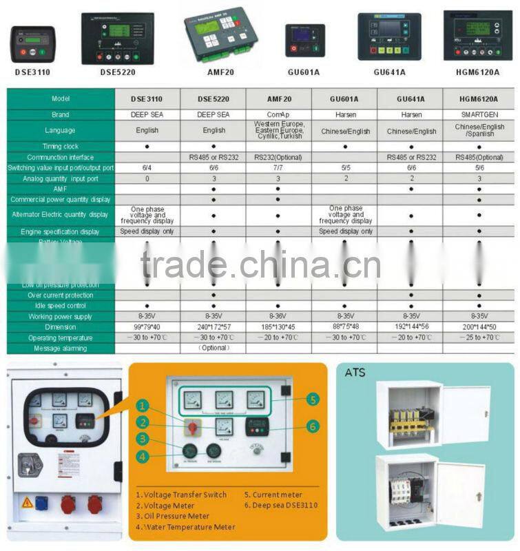 | The control panel is general control panel, with the display of voltage,current, frequency, water temperature, oil pressure. The general control panel is composed of circuit breakers, ammeter, voltmeter, frequency tables, water temperature, oil pressure gauge, oil temperature gauge, tachometer, timer and current transformer and so on, can complete the diesel generator set start and stop, power supply and power control function, and the generator set running for measurement, display, overload alarm and protection | ||||||||