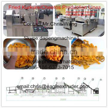Kurkure/Cheetos are kind of special extruded snacks, very crunchy and delicious in taste. They are made by a special extrusion process. The corn grits are moisturized by water in the flour mixer and fed to the Rotary Head Extruder. In the extruder, due to the rubbing of two rotary plates, the corn grits are squeezed and twisted to curls shapes. The cutting knives can cut them into required length. The Kurkure/Cheetos can be fried in fryer then cooled before flavoring. Seasoning is sprayed onto their surface to get different delicious tastes. Due to their delicious tastes and nutrition, they are quite popular with consumers.