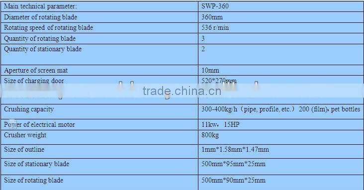 SWP- 360 plastic crusher is a favorable machine for recycling large profiles and pipes. It bears the features of large crushing capacity, high output and stable working performance, and it is equipped with material suction machine, which improve the automation degree of the crusher.