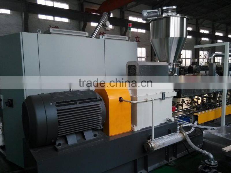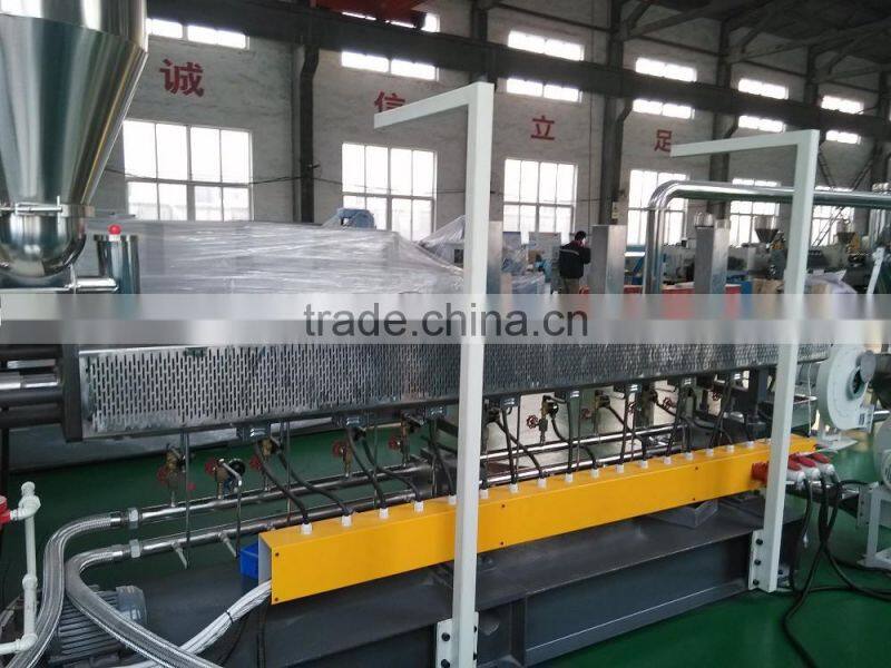 Parallel twin-screw granulating machine is composed of parallel twin-screw extruder, granulating die head, granule cutting machine, three-grade air supplying system, storage chamber. The parallel twin-screw adopts modular construction, with advantages of all gear-closing and strong self-cleaning. The barrel has a good exhaust effect. The bi-metal alloy bushing is of war-resistance and corrosion-resistance. The machines can be combined free according to the characteristics of materials and production process, so it is widely use. Die head is made from high-quality mould steel, under hard chrome plating treatment. The reasonable-distributed material running channel can ensure the uniform extrusion of the granules without mutual influence. The unique three-dimensional cooling structure and the new-type multi powerful blower cooling mode make the cooling effect better. Besides, the precise cutter ensures the even and smooth surface of the products. The speed frequency regulation meets different material granulating requirement. This production line has features of high production efficiency, low-consumption, etc, especially applicable to the WPC granulating process.
