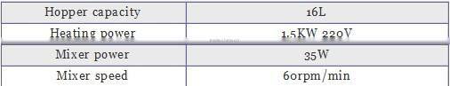 The filling machine is a small heating tank capacity of 15 liters sandwich with a heating and mixing functions to achieve through internal compartment heating pipe heating water bath heated, the water temperature can be set to control, and if heated over 100 degrees can use thermal oil, put feed port is also fitted with a heating block, to prevent solidification of the material. Machine compact, easy to operate.