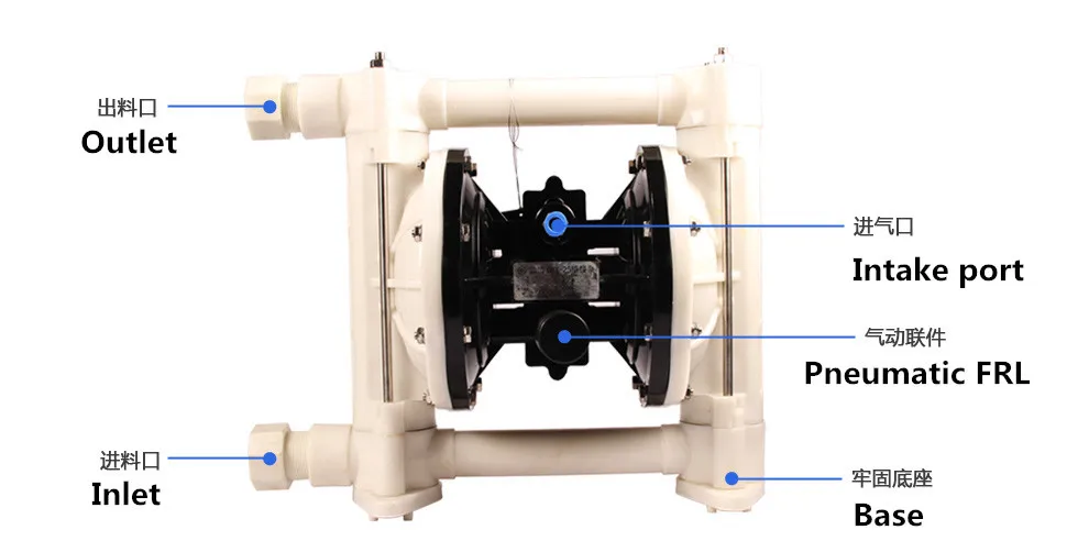 In two symmetric cavity pump, each equipped with a flexible diaphragm, link will be two pieces of the diaphragm are connected into a whole, the compressed air into the air from the air intake valve pump coupling, drive two the working chamber of the diaphragm, diaphragm and drove two block motion link connection. At the same time, the other working chamber of the gas from behind the diaphragm discharge pump, once it reaches the end of stroke, gas distribution mechanism is automatically compressed air into a working chamber, push the diaphragm in the opposite direction, so that the formation of the synchronous reciprocating two diaphragm movement. Each working chamber is provided with two single ball, the reciprocating diaphragm, causing changes in the working chamber volume, forcing the two one-way ball alternately opened and closed, and the liquid continuous suction and discharge.
