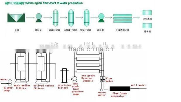 The system includes preprocessing part (booster pump, precision quartz sand filter, activated carbon adsorption filter quality, 5 μ M filter), RO reverse osmosis part (equipment control, high pressure water pump, RO components, control sensor), mixed bed part (mixed bed column, cation resin, anion exchange resin). Water finally into pure water tank, pump water to pure water, pure water tank to prevent bacterial contamination of RO water, ensure that the effluent quality.
