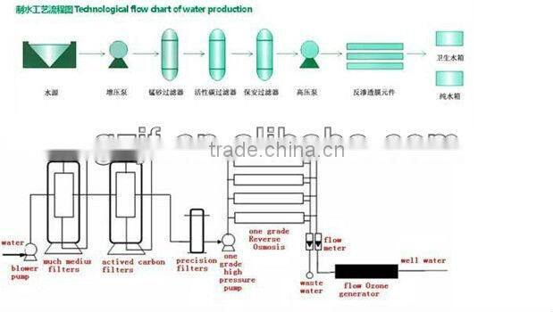 Source of water →Booster pump →Manganese sand filter →Activated carbon filter →High-pressure pump →Reverse osmosis membrane element →Pure water tank →Water