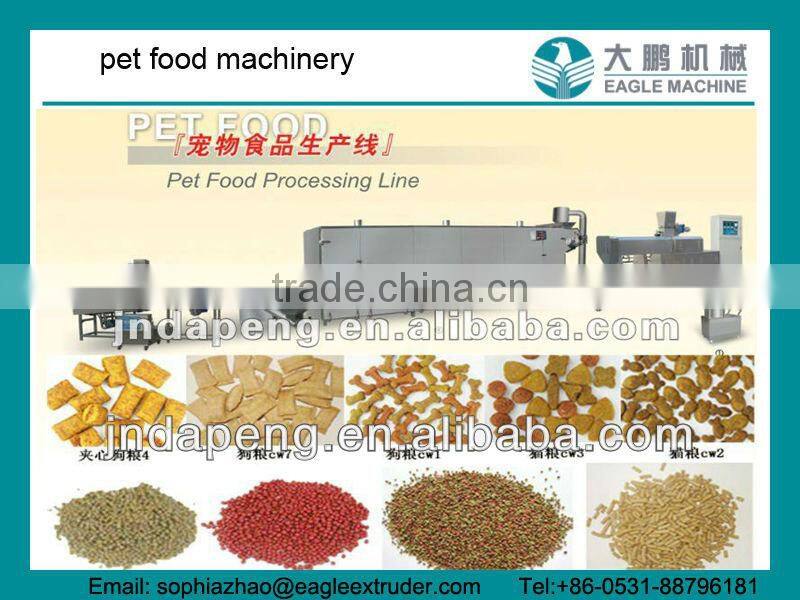 Pet food line is used for processing for dogs and cats (pet food), birds, piglets, frogs, sinking and floating aquatic feeds for fish. Which is high and new technical program as to catch the developing pet food market. Pet food line mainly use maize, fish powder, meat powder and some food additive as main raw material, through mixing, extruding, roasting, flavoring to get the final puffed pet food.