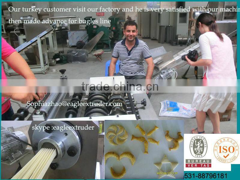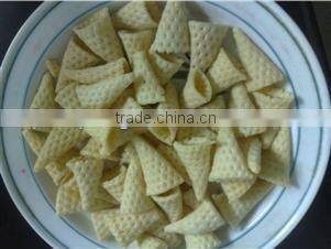 The raw materials can be rice powder, corn powder, wheat flour individually or their mixture. Only by changing the moulds, shaping rolles or cutting machine, the shapes can be various: like sticks, square sheet rib chips, diamond chips, wavy chips, bird shaps,pet shapes,star shapes,pillow shapes and bugles etc. The taste is good and also without greasiness