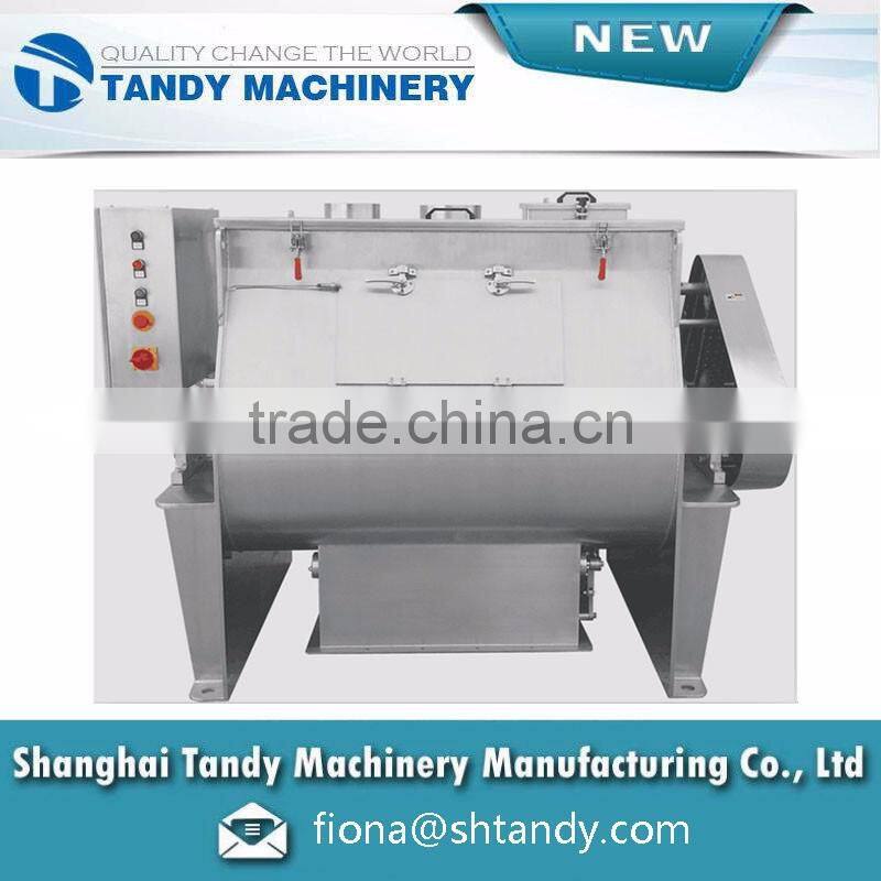 The Horizontal Ribbon Mixer consist of U-Shape tank, spiral and drive parts. The spiral is dual structure. Outer spiral make the material move from the sides to the center of the tank and the inner screw conveyor the material from the center to the sides to get the convective mixing. Our TDL series Ribbon Mixer can mix many kinds material especially for the powder and granular which with stick or cohesion character, or add a little liquid a paste material into powder and granular material. The mixture effect is high. The cover of the tank can be made as open in order to clean and change parts easily.