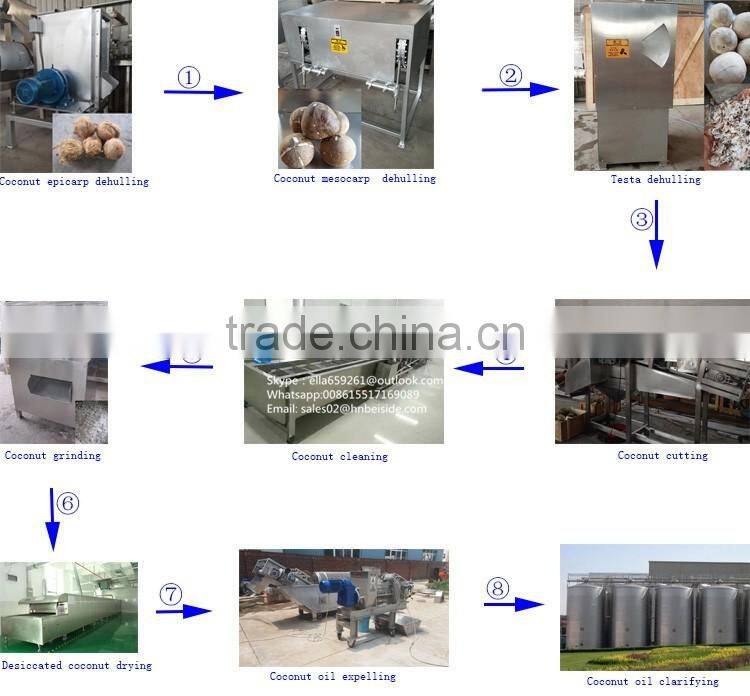 1.Fresh coconut --- 2. Epicarp dehulling --- 3.Mesocarp dehulling --- 4. Testa dehulling --- 5. cutting --- 6. Cleaning --- 7.Grinding--- 8. drying(≤75℃) --- 9. pressing(≤60℃) --- 10. Clarifying or centrifugation --- 11. storage --- 12. virgin coconut oil