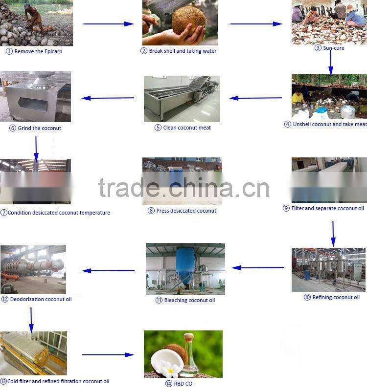 Coconut - Remove the Epicarp → break shell and taking water → sun-cure → unshell coconut and take meat → clean coconut meat →grind the coconut → condition desiccated coconut temperature → press desiccated coconut → filter and separate coconut oil → refining coconut oil → bleaching coconut oil → deodorization coconut oil → cold filter and refined filtration coconut oil → Fill RBD