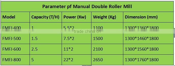 Manual Double Roller Mill is the main device for flour milling plant (wheat,corn,bean,etc.),The operating of the feeding roller and cluth could be controlled manually,the configures adjust according to different grinding characters.