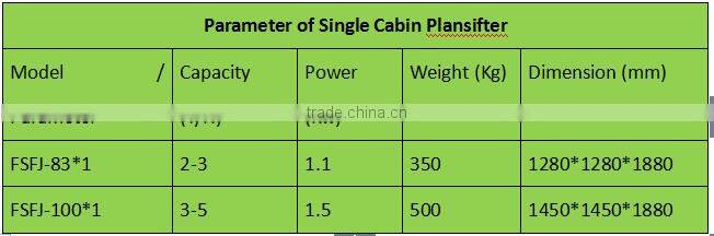 Single Cabin Plansifter is used to sift and grade powdery material, is wildely applied to maize processing plant, fodder plant, alcohol plant. It is featured of low power consumption, high production, and good sealing without flying powder .