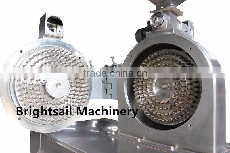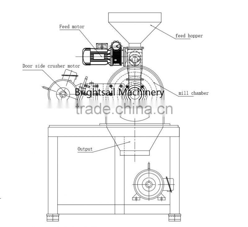 Bidirectional pair wheels adopt the way of reverse rotation of front and back grinding wheels, thus this way improves the crushing effect. Double discs install the needle cylinders whose diameters are different, every part arrays needles and bars through the technology of three dimensional simulation, designing the layout rationally and thus it can control the materials to achieve the effective split effect in the gap of needle bar efficaciously. Needles and bars can adopt the shape of hexagonal、square、wolf teeth and so on according to crushing materials. The shape of wolf teeth is all called corn cob rollermill, and this machine has the special effect for the engineering plastic with high melting point to flour at room temperature. Needle and bar mill adopt the way of quantitative feeding of screw, controlling the even motion of materials in the inward of millstone. The ways of discharge are output in the natural state and discharge of negative pressure method. This machine does not have mesh screen in the chamber of grinding wheel, and it adjusts the fineness of crocus through the wire-speed of mill wheel, it can also classify materials through external grading method.