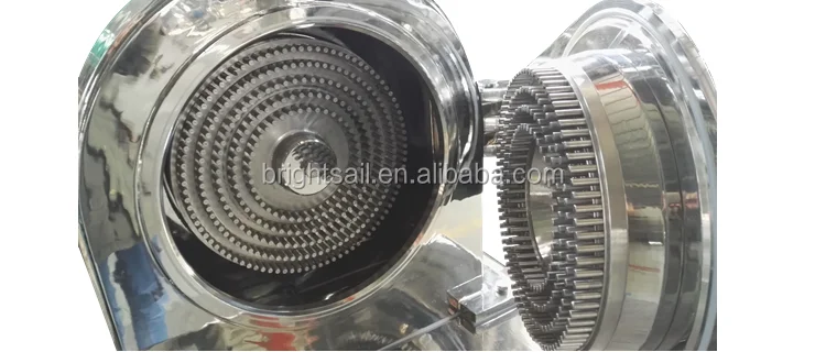 Bidirectional pair wheels adopt the way of reverse rotation of front and back grinding wheels, thus this way improves the crushing effect. Double discs install the needle cylinders whose diameters are different, every part arrays needles and bars through the technology of three dimensional simulation, designing the layout rationally and thus it can control the materials to achieve the effective split effect in the gap of needle bar efficaciously. Needles and bars can adopt the shape of hexagonal、square、wolf teeth and so on according to crushing materials. The shape of wolf teeth is all called corn cob rollermill, and this machine has the special effect for the engineering plastic with high melting point to flour at room temperature. Needle and bar mill adopt the way of quantitative feeding of screw, controlling the even motion of materials in the inward of millstone. The ways of discharge are output in the natural state and discharge of negative pressure method. This machine does not have mesh screen in the chamber of grinding wheel, and it adjusts the fineness of crocus through the wire-speed of mill wheel, it can also classify materials through external grading method.