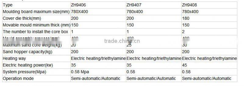 ZH9560 core shooting machine is applicable to produce all kinds of complicated sand cores for mass production! It has advantages of accurate sand core size, high productivity, low labor intensity and so on! It adopts the electric heating mode and equipped with the appropriate temperature-controlled instrument.