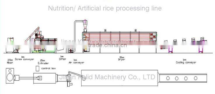 It takes the rice, millet, black rice, buckwheat and all kinds of corns and cereals as raw material and makes the vitamin, protein and mineral composition mixed, extruded, then it can become the rice appearance again.