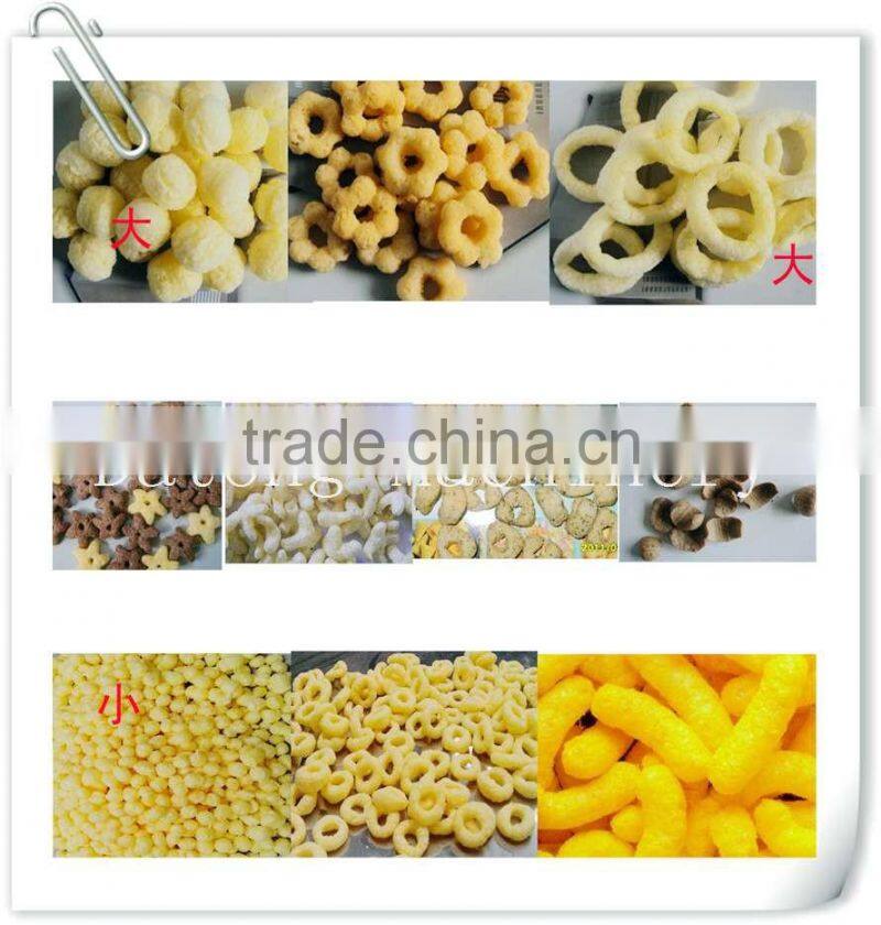 Corn puff snack extruder can take corn, rice, wheat, oat, rye and other grains as materials to produce extruded snacks, with crispy taste and lively shape.