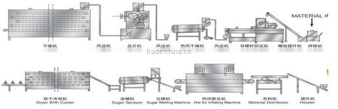 Corn flakes/breakfast cereals are a kind of breakfast with high nutritional value. They usually use corn powder and other cereals as main raw material, through mixing, extruding, flaking, drying, baking, coating and cooling, to get crispy flakes. It always service as breakfast cereal mixed with milk of coffee. But it can also be a kind of leisure snacks. This process line can also make other shapes of cereals such as rings, balls, chocos, curls etc