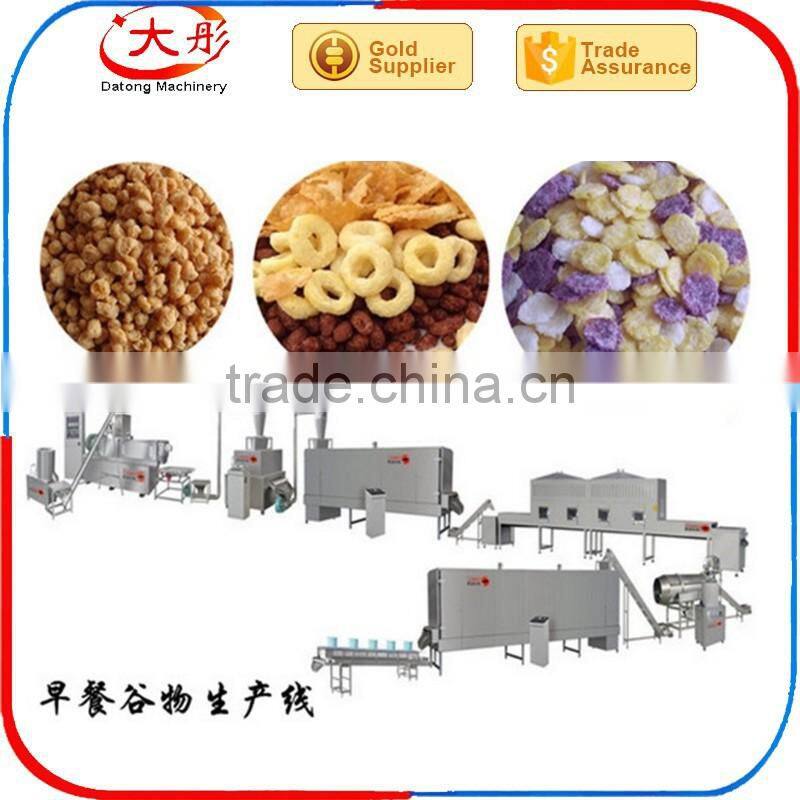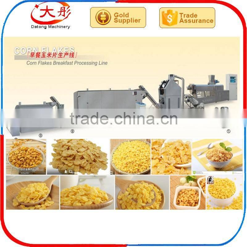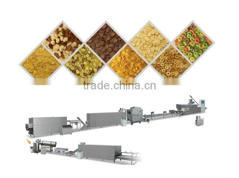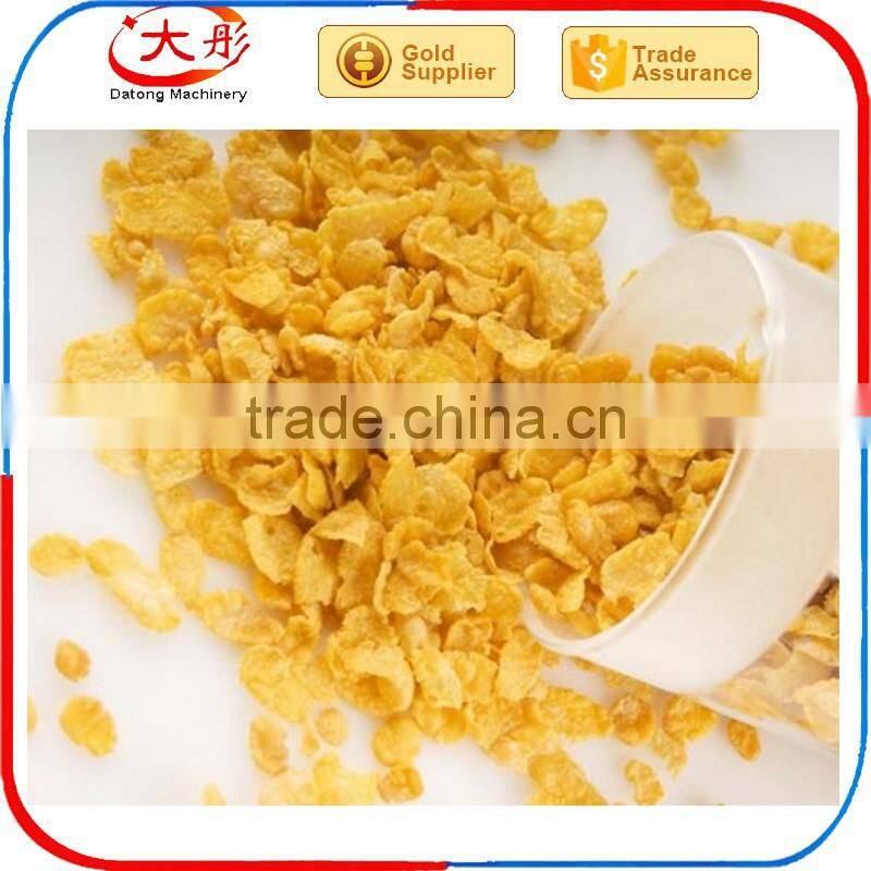 Corn flakes making machine can produce corn flakes and breakfast cereal which is one kind of nutritional convenient food which is produced by this process line, using grist as basic material, with different shapes, such as, granule, flake, animal, etc. One outstanding characteristic of the breakfast cereal is that it contains abundant compound carbohydrates and dietary fiber, strengthens lots of microelements, such as vitamin and mineral, and also can be added with cocoa and sugar, like honey and maltose. It can be drunk directly after mixed into coffee, milk, yoghourt or functional drink. Children can eat breakfast cereal as sweet crispy snack.