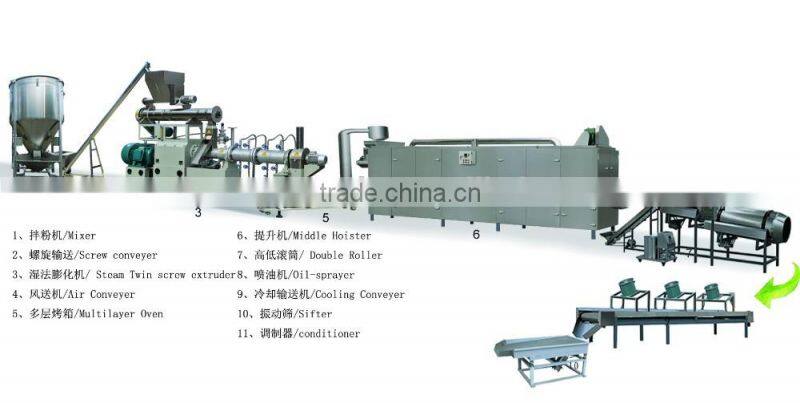 1.mix machine: the raw material corn flour, rice flour, soybean meal, meat powder, grain powder, additives, adding a certain proportion of water mix evenly.