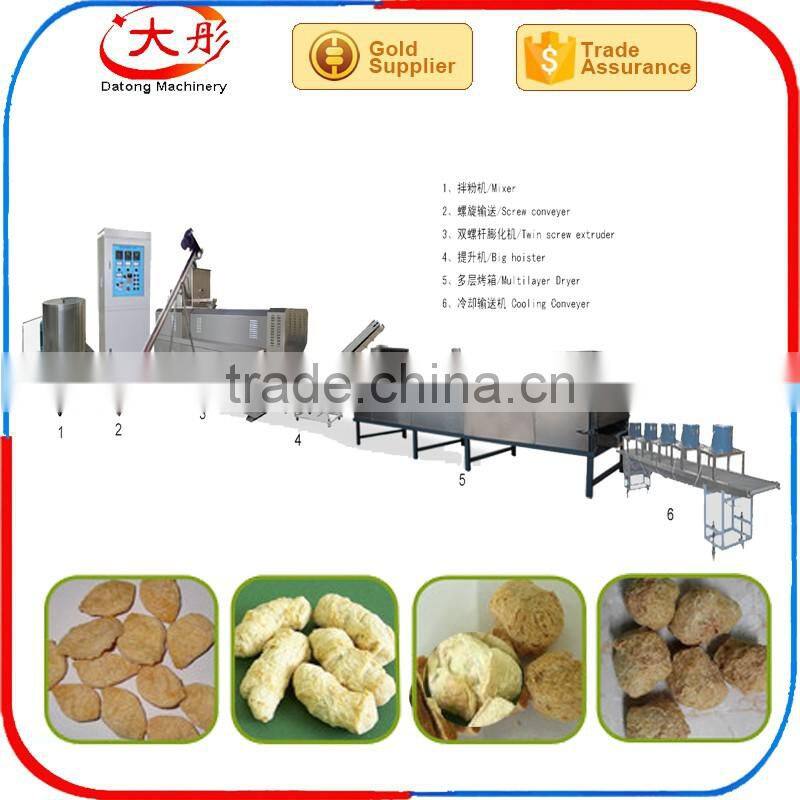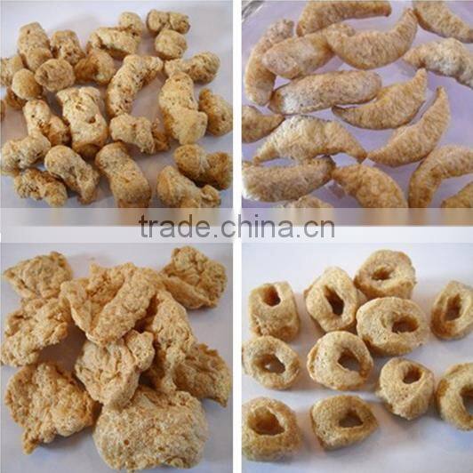 Soybean protein food processing line takes soybean and peanut as main raw materials. After milling, mixing, tempering, high-temperature, high-pressure, high-cutting, then the spherical protein molecules change into chains and becomes layer fiber structure. It is similar with the muscle state of the animal and without the smell of beans.