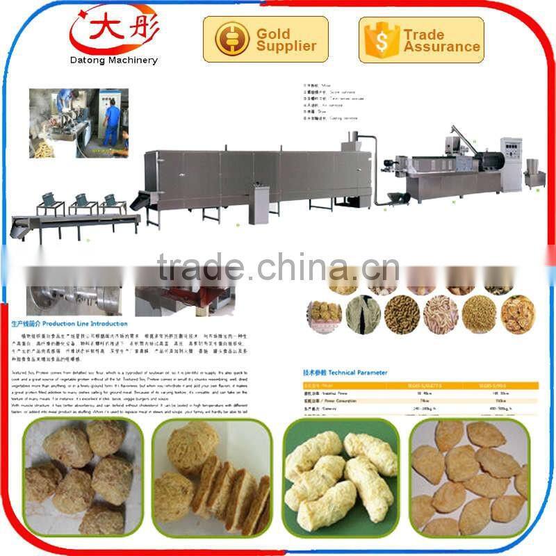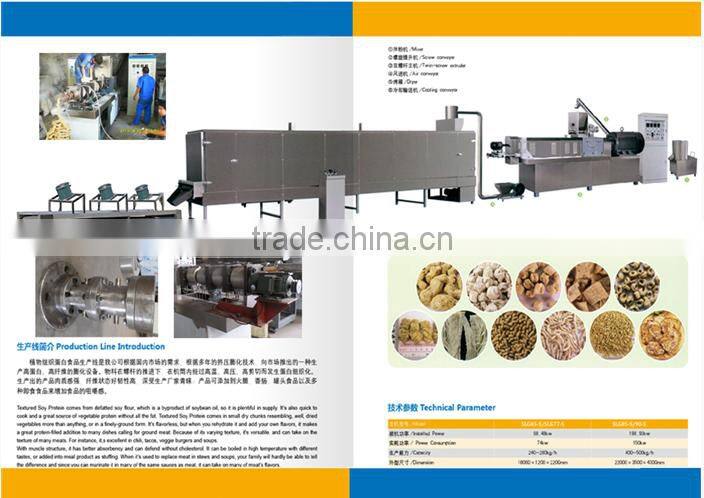 Soybean protein food processing line takes soybean and peanut as main raw materials. After milling, mixing, tempering, high-temperature, high-pressure, high-cutting, then the spherical protein molecules change into chains and becomes layer fiber structure. It is similar with the muscle state of the animal and without the smell of beans.