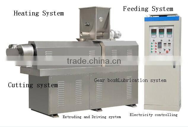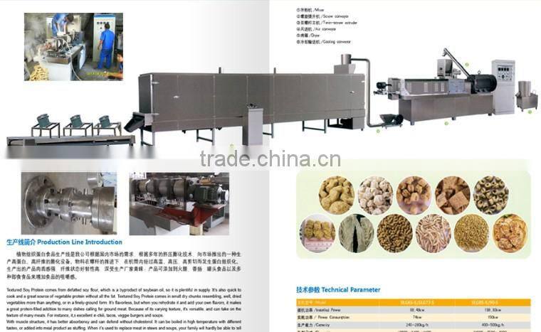 Soya Bean Protein Machine is developed and manufactured on the basis of our experience combining with the advanced machines from foreign countries. This line takes soybean meal and peanut meal as main raw materials. After milling, mixing, extruding and cutting, the meal becomes layer fiber structure. With high nutrition, the finished products look and taste like meat, absorb oil and water easily, no cholesterol and animal fat, so it is widely used in meat products industry, fast food production, deepfreeze food production and all kinds of vegetarian snacks and food.