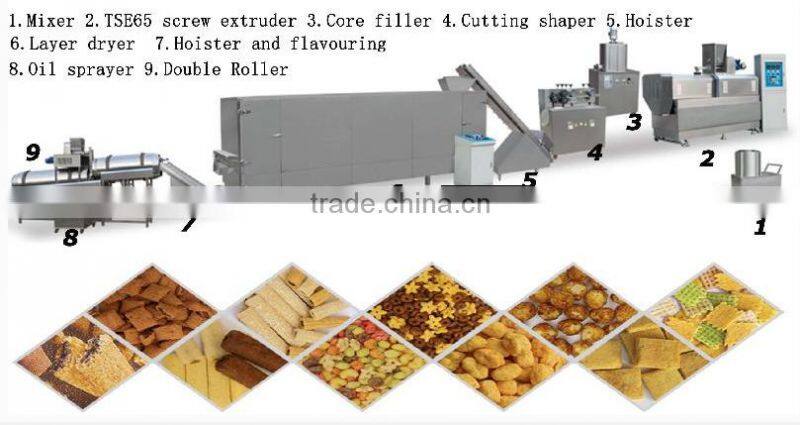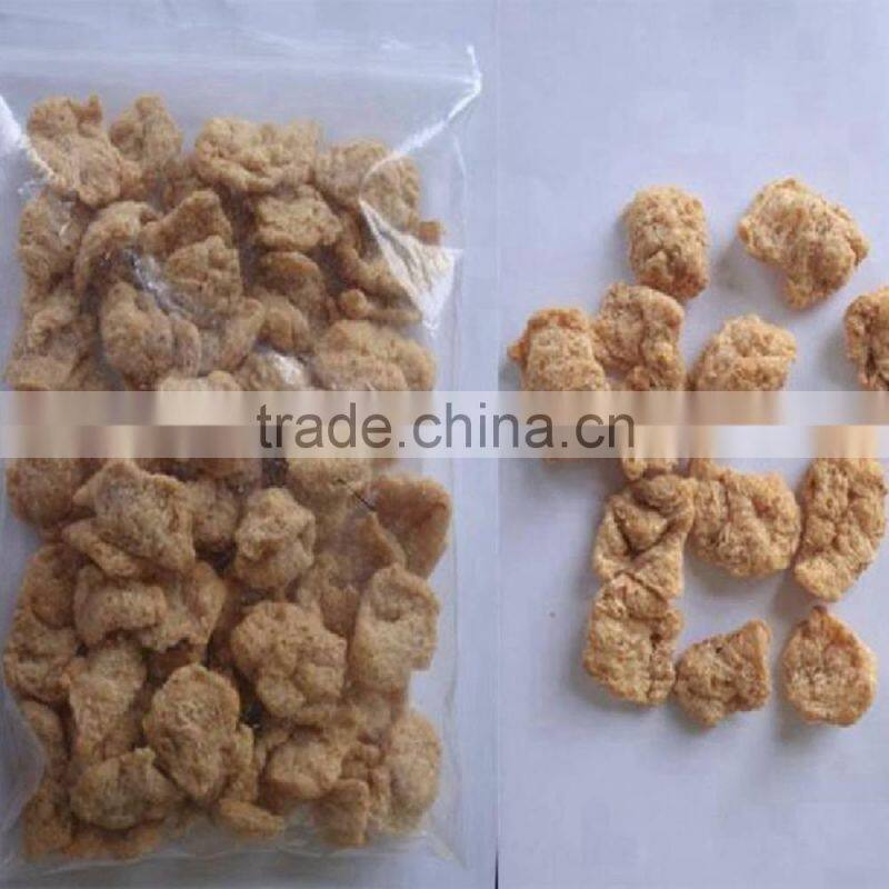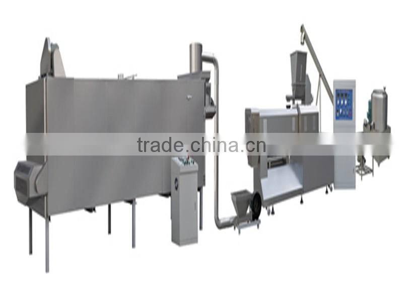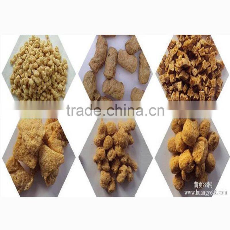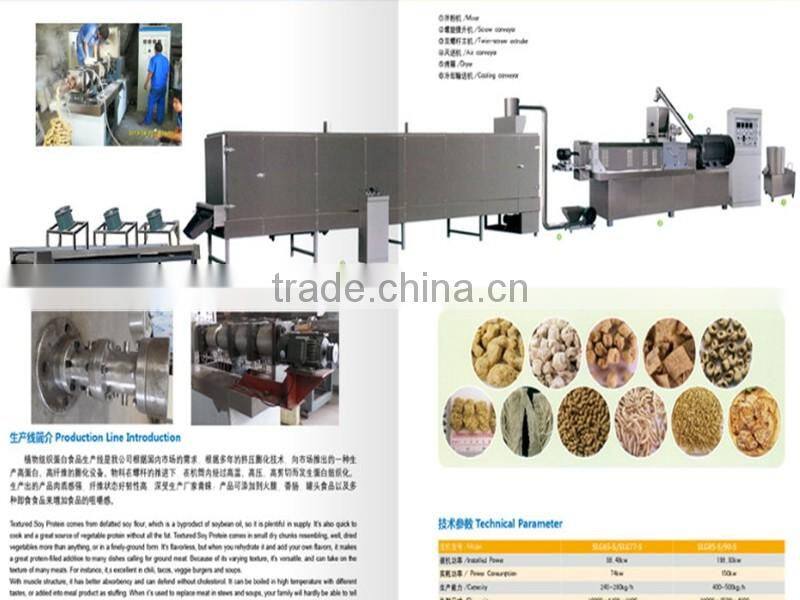 Soya Bean Protein Machine is developed and manufactured on the basis of our experience combining with the advanced machines from foreign countries. This line takes soybean meal and peanut meal as main raw materials. After milling, mixing, extruding and cutting, the meal becomes layer fiber structure. With high nutrition, the finished products look and taste like meat, absorb oil and water easily, no cholesterol and animal fat, so it is widely used in meat products industry, fast food production, deepfreeze food production and all kinds of vegetarian snacks and food.