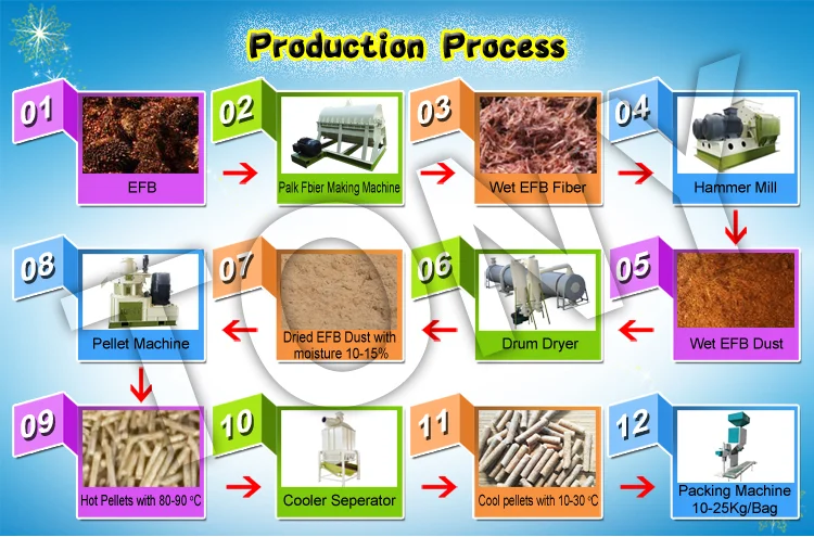 EFB Pellet Production Line/Palm Kernel Shell Fiber Granulating Line through our research and design is manufactured for produce the wood pellets.Main equipments within it include Wood Crusher, Dryer, Storage bin, Screw Conveyor, pellet mill, Hoisting machine, Cooling and dusting machine and Packing machine. It has advantages such as compact structure, good appearance, high yield, less consumption, convenient and reliable performance etc.
