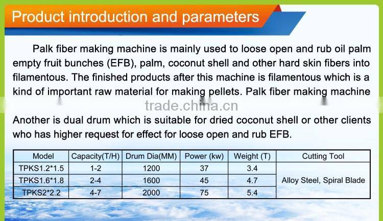 palm fiber silk making machine mainly used to loose open and rub oil palm empty fruit brunches(EFB), palm,coconut shell and other hard skin fibers into filamentous. Finished products after this machine is filamentous which is important raw material for making pellets.