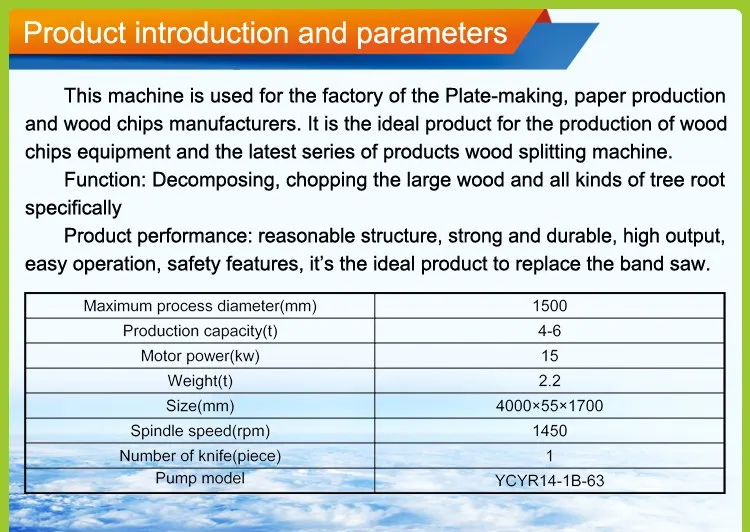 The machine is designed to cut the big stump, big branches, large logs and hard wood to small size which can be fit for making wood chippers or for other use.