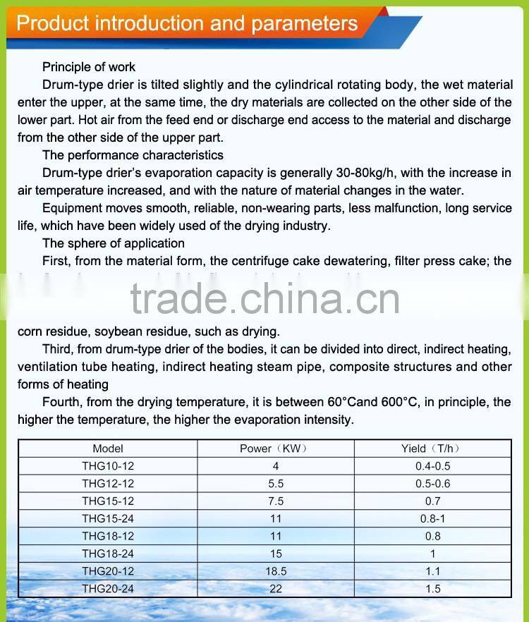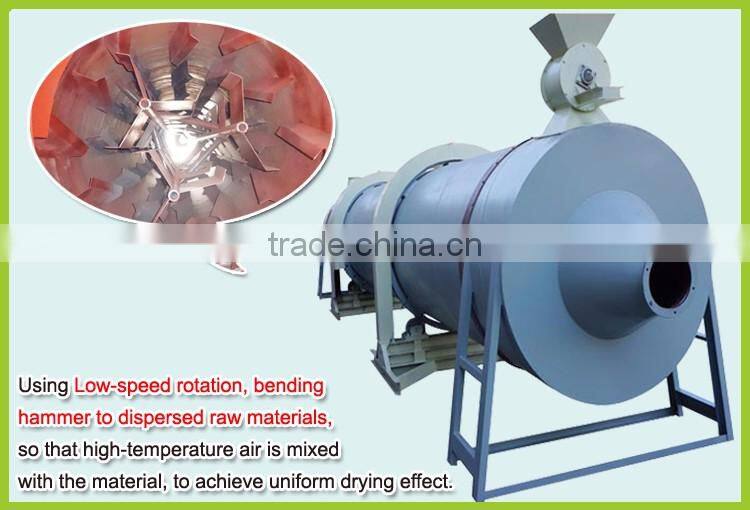 Tony rotary drum dryer adopts low-speed rotarying curved plate hammering, diapersing raw material to make high temperature air flow current mixed with raw material to achieved drying goal. It is applied to dry powder raw material.